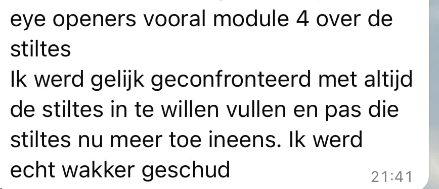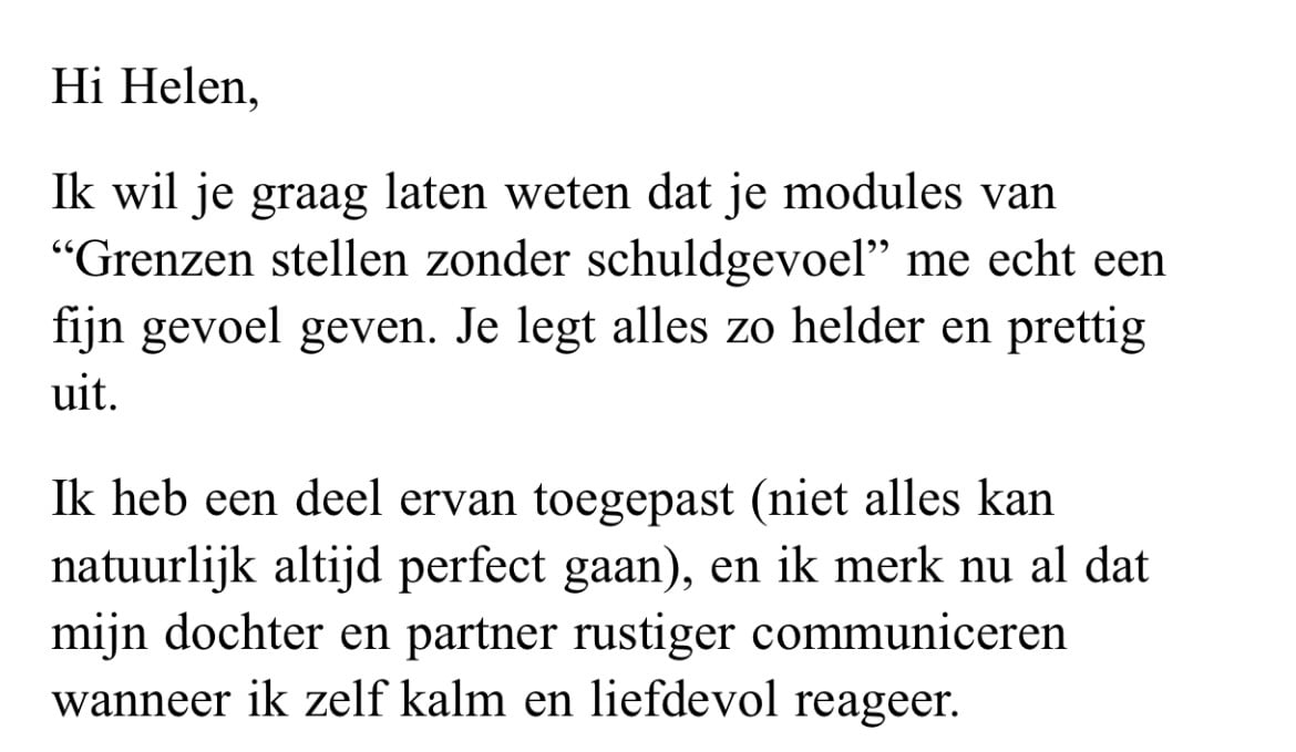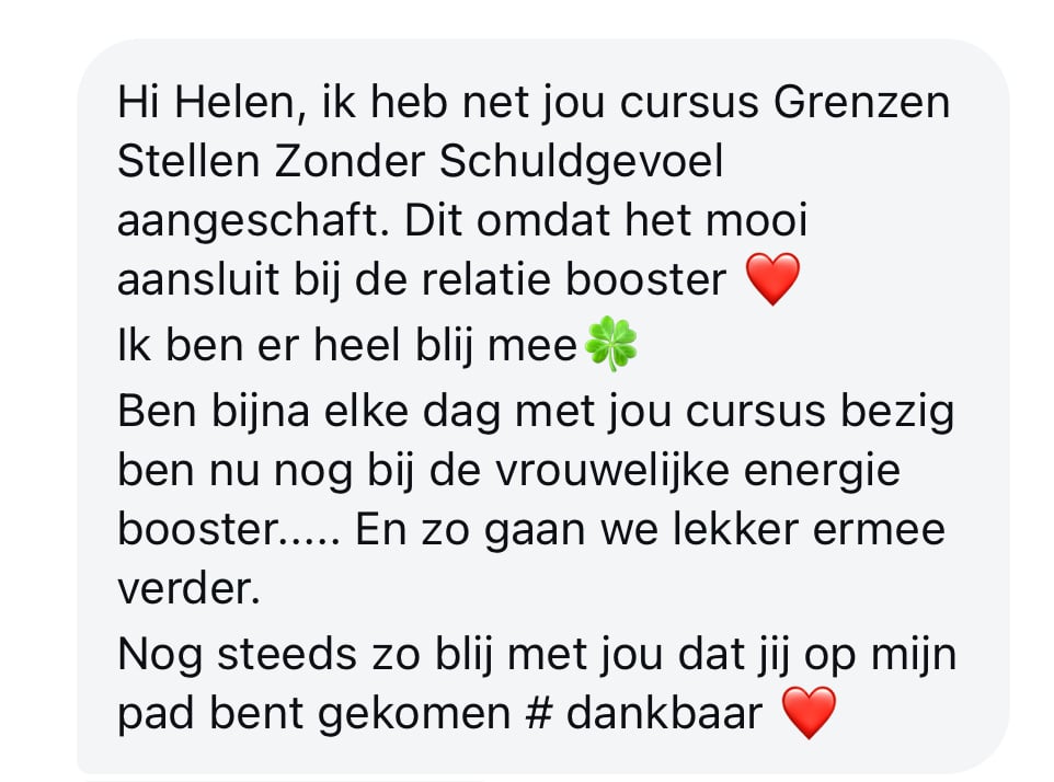 " Hoe mooi is dat, wanneer je grenzen durft aan te geven, je ruimte in te nemen, voor jezelf te kiezen. Je gaat van poeple pleaser naar dat schuldgevoel verdwijnt. Deze cursus Grenzen Stellen Zonder Schuldgevoel is echt een game changer. Dankbaar! (anoniem)"